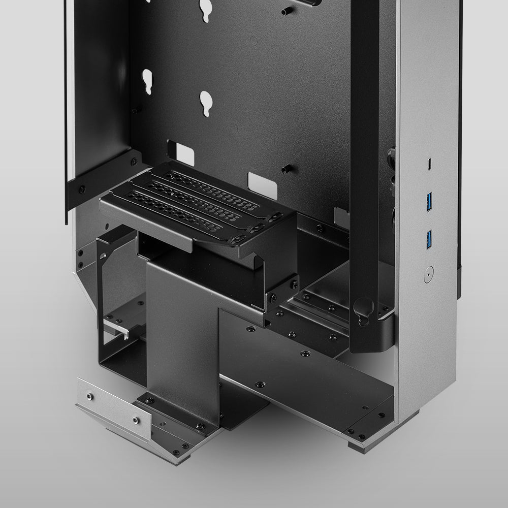 OPUS supports up to 360 mm long and triple slot GPUs. The sturdy GPU bracket supports monstrous graphics card, and comes included with a 300 mm long PCI-e 4.0 riser cable.